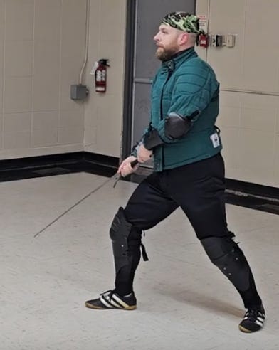 This position does indeed lay the point upon the ground and to the side of the fencer. However, I find it too extremely exaggerated for 3227a’s purposes. I have an upcoming article about how guards and positions are used in 3227a, so I won’t get into depth at this time, but I think this position is too fixated on defence only and a good 3227a guard should enable defence or offence equally.