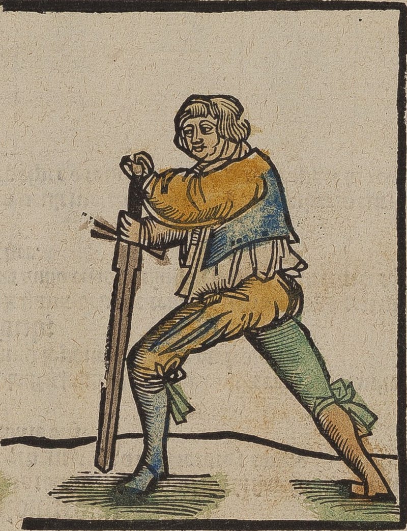 There is an old argument about how 3227a identifies the guards of Plow (Pflug) and Fool (Alber) and how it is different from how the RDL sources do. As seen above, the position with the point on the ground in front or beside the fencer is called Plow in the Codex. The Fool is associated with the lower hengen: “The third guard, the Fool, is the low hanging, with it one breaks all cuts and thrusts whosoever commands it correctly”.