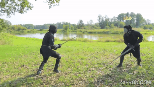 One technique is called the Schrankhut (barrier guard) and comes from the point so that you put the point down to the ground to whichever side you want and thus you place yourself to the Absetzen. It may also be done from the gate when someone puts the point down to the ground in front of himself. And now if someone strikes or thrusts you so grab the point of the opponents sword while moving upwards with the Absetzen and strike him low to his feet or above or wherever he may hit him best.